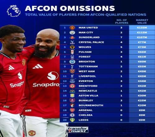 德转列英超各队非洲杯晋级国家球员总身价排名: