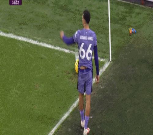 阿诺德就很擅长利用自己的底裤,2023年他用一招“紫腚赢”,迷惑了摄像头,也迷惑了对手,角球助攻范戴克破门。