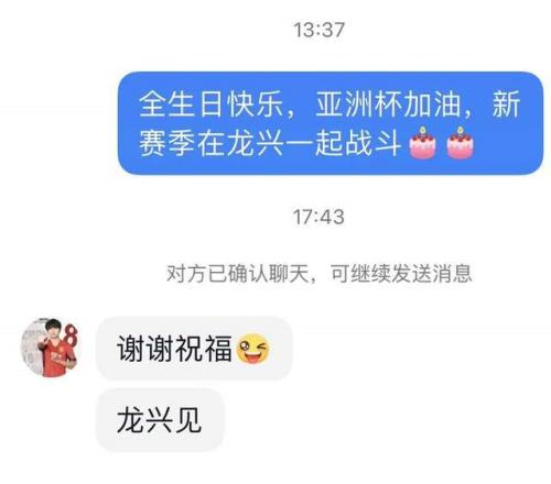 另一名中场核心李镇全,和多支球队产生联系,有球迷私信李镇全为他送上了生日祝福,并表示新赛季在龙兴一起战斗。李镇全的回复到:“谢谢祝福,龙兴见”,这一语双关让球迷可以放心了。首先李镇全新赛季还会为重庆效力,哪也不会去,冲了两个赛季才升入中超,球员对球队有感情。其次,也再一次确定明年重庆铜梁龙的主场将会放在龙兴。