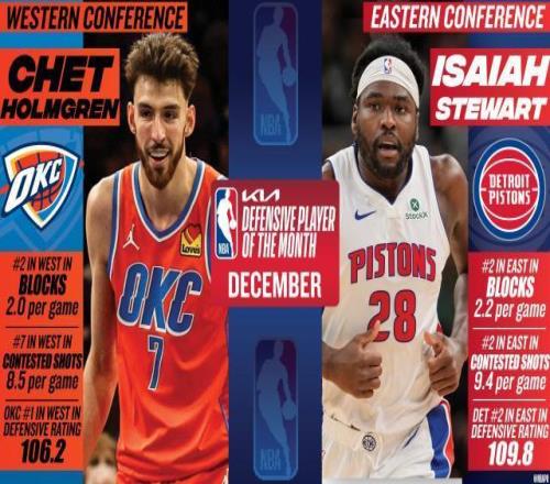12月场均2.2盖帽(东部第二),场均9.4次干扰投篮(东部第二),活塞防守效率东部第二(109.8)。