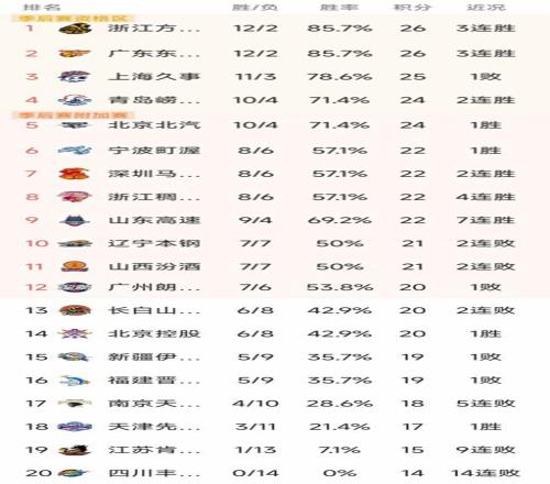 宁波、深圳和浙江稠州都是8胜6负积22分,宁波和深圳成为最强黑马之一。山东以9胜4负积22分暂列第9名,他们的7连胜是目前联盟最长连胜。辽宁和山西的战绩是7胜7负积21分暂列第10和第11名,广州以7胜6负暂列第12名。吉林和北控都是6胜8负积20分暂列第13和第14。新疆和福建都是5胜9负暂列第15和第16,南京遭遇5连败,4胜10负排在第17,天津3胜11负排在第18,江苏1胜倒数第二,四川14连败垫底!